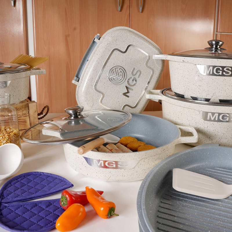 اگر به دنبال آشپزی سالم هستید یا رژیم غذای خاصی را دنبال میکنید، باید از ظروفی استفاده کنید که این امر را برایتان فراهم سازند. ظروفی که میزان مصرف روغن را به حداقل رسانده و کیفیت مواد غذایی را حفظ کنند. ظروف پخت و پز ام جی اس با استفاده از گرانیت تولید شده و بسیار نچسب و باعث افزایش سختی و مقاومت در برابر خط و سایش می شود. سرخ کردن انواع مواد غذایی در این محصول نیازی به روغن فراوان ندارد و با کمترین میزان روغن هم میتوان به غذایی ترد و مغز پخت دست یافت. انتقال گرما را به صورت یکنواخت به کل قابلمه، قابلیت شست و شو در ماشین ظرفشویی از ویژگی های این محصول می باشد.در پوشش خارجی این ظروف از رنگ با کیفیت و مقاوم در برابر حرارت (HEAT RESISTANT) استفاده شده است به نحوی که به مرور زمان یا با استفاده طولانی مدت، رنگ خارجی آنها تغییر نکند.