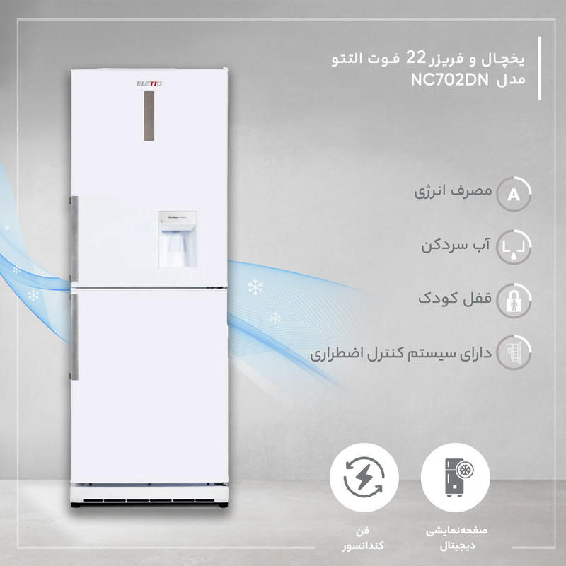 یخچال و فریزر «التتو» مدل «NC702DN» یکی از یخچال فریزرهای پرکاربرد و متناسب با سلیقه خانوادههای ایرانی است.در این محصول با اضافه کردن آپشن > به زیبایی محصول افزوده ایم .این دستگاه از سری یخچال و فریزرهای کمبی است که قسمت بالا به یخچال و قسمت پایین به فریزر اختصاص داده شده است که با حجم مفید کل 370 لیتر برای خانوادهها با جمعیت متوسط تعبیه شده است از ویژگیهای منحصربهفرد این یخچال و فریزر مصرف انرژی بسیار خوب آن با نمودار A است. این محصول دارای صفحهنمایشی دیجیتال با عملکرد آسان است و امکان مشاهدهی تنظیمات را به شما میدهد. این نمایشگر تغییر دمای یخچال و فریزر، فعالکردن حالت انجماد سریع و سایر تنظیمات را برای شما امکانپذیر میکند. امکان استفاده بهینه از فضای یخچال با حذف یکی از طبقات جامیوهای، روشنایی بیشتر و مصرف انرژی کمتر با استفاده از چراغهای SMD از ویژگیهای این محصول است. همچنین استفاده از دو اواپراتور جهت کاهش مصرف انرژی و بهبود عملکرد محصول است. امکاناتی مانند سرد کردن سریع و قفل کودک، سیستم کنترل اضطراری در صورت نقص فنی استفاده از این یخچال را لذتبخش و ساده کرده است. این یخچال فریزر مجهز به فن کندانسور جهت خنک سازی کندانسور است.